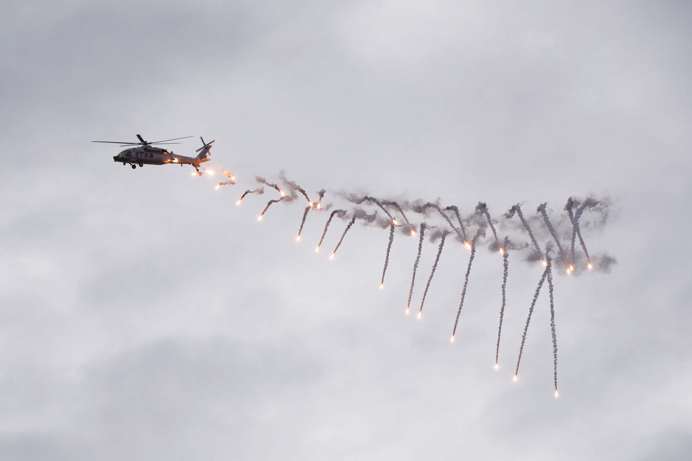 5月26日,中柬“金龙-2025”联演海空方向实兵演练在柬埔寨西哈努克港附近海空域举行,参演直升机发射热诱弹。