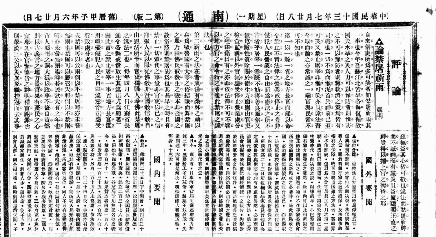 清代至民国,旱灾愈演愈烈。1928年报载南通“自春徂夏,河水浅涸,泥土干瘠,棉种待雨萌芽”,乡间农人“翘首企足,盼望甘霖下降”的焦灼画面跃然纸上。
