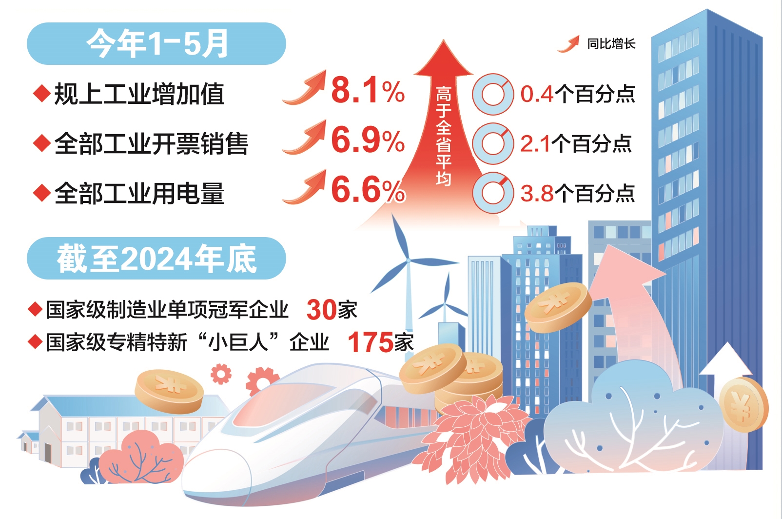 重点企业蒸蒸日上,为南通工业经济这棵大树的枝繁叶茂提供了更多养分。今年以来,全市工业经济延续平稳增长的良好态势,“压舱石”作用进一步夯实。1—5月,全市规上工业增加值、工业开票销售、工业用电量同比分别增长8.1%、6.9%和6.6%,分别高于全省平均0.4、2.1、3.8个百分点,均为苏五城市第一。