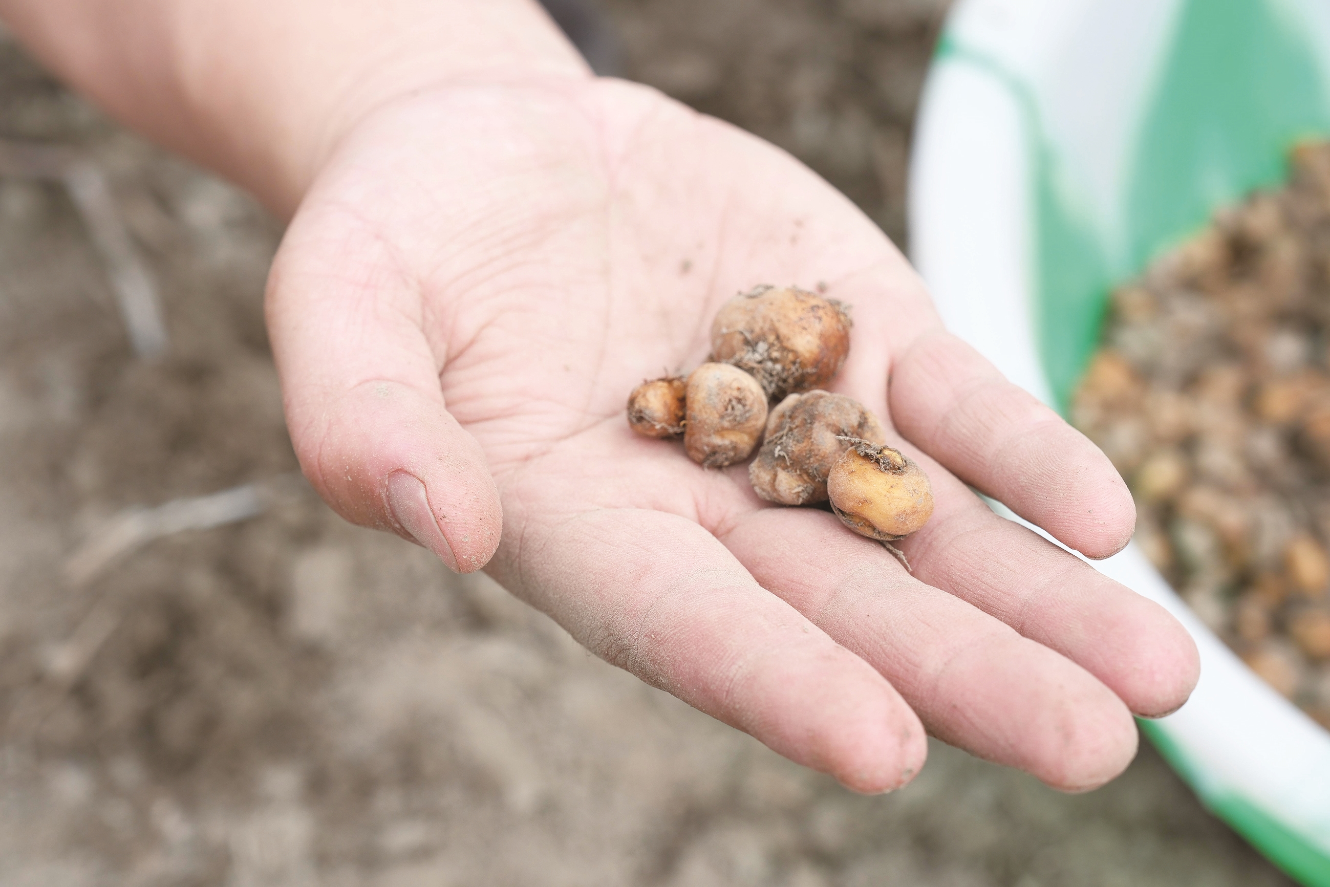 16日一早,位于如东河口镇锦成村的南通三道农业有限公司种植基地里一派繁忙景象,40多名村民正抢抓时节,手持小钉耙,坐在小板凳上,在地里轻扒细翻。小钉耙起落间,一颗颗裹着泥土、圆滚滚的元胡便破土而出。这些被刨出来的“金果果”,被小心翼翼地装入盆里。