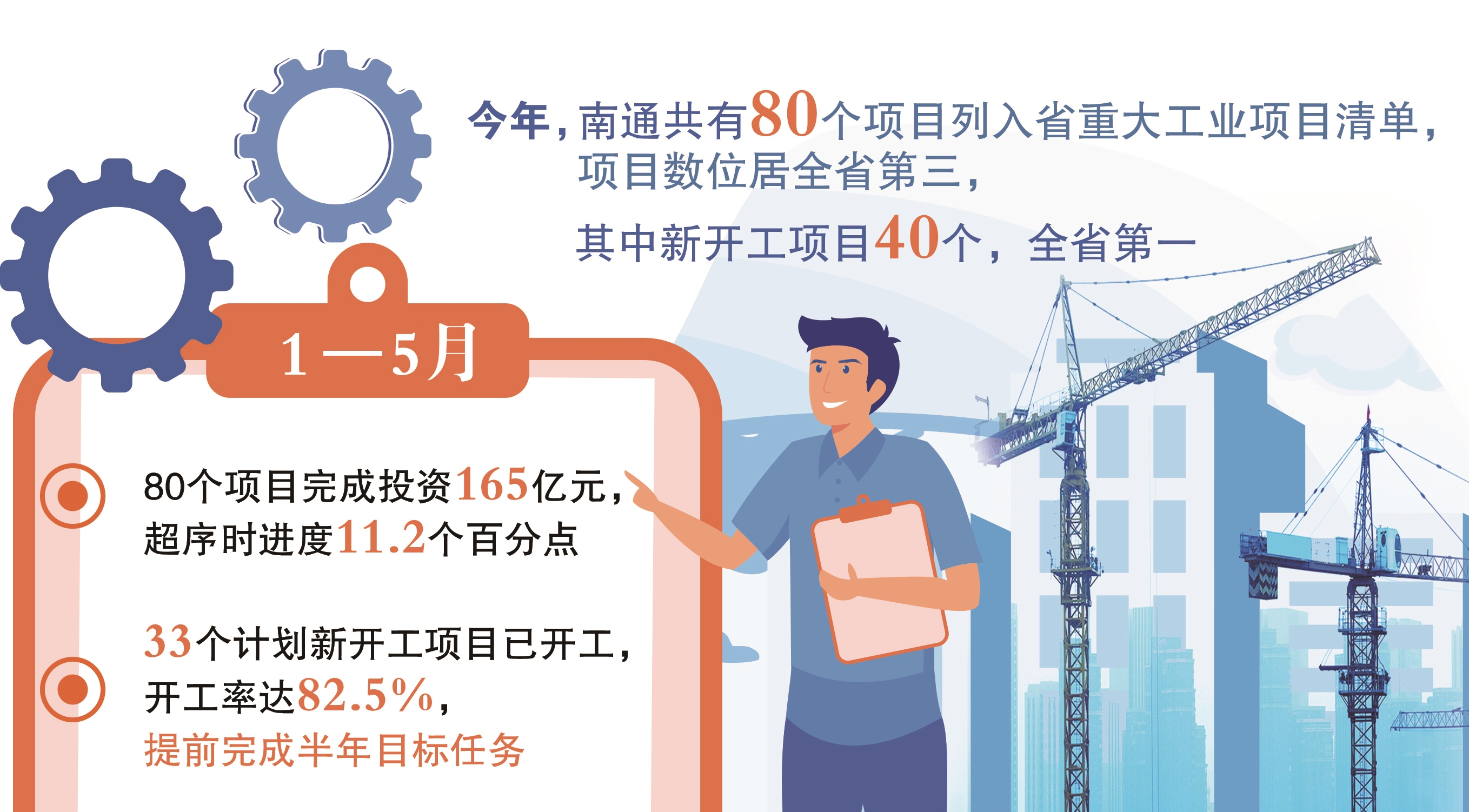 项目为王,实干为先。今年,南通共有80个项目列入省重大工业项目清单,项目数位居全省第三,其中新开工项目40个,全省第一。1—5月,80个项目完成投资165亿元,超序时进度11.2个百分点;33个计划新开工项目已开工,开工率达82.5%,提前完成半年目标任务。