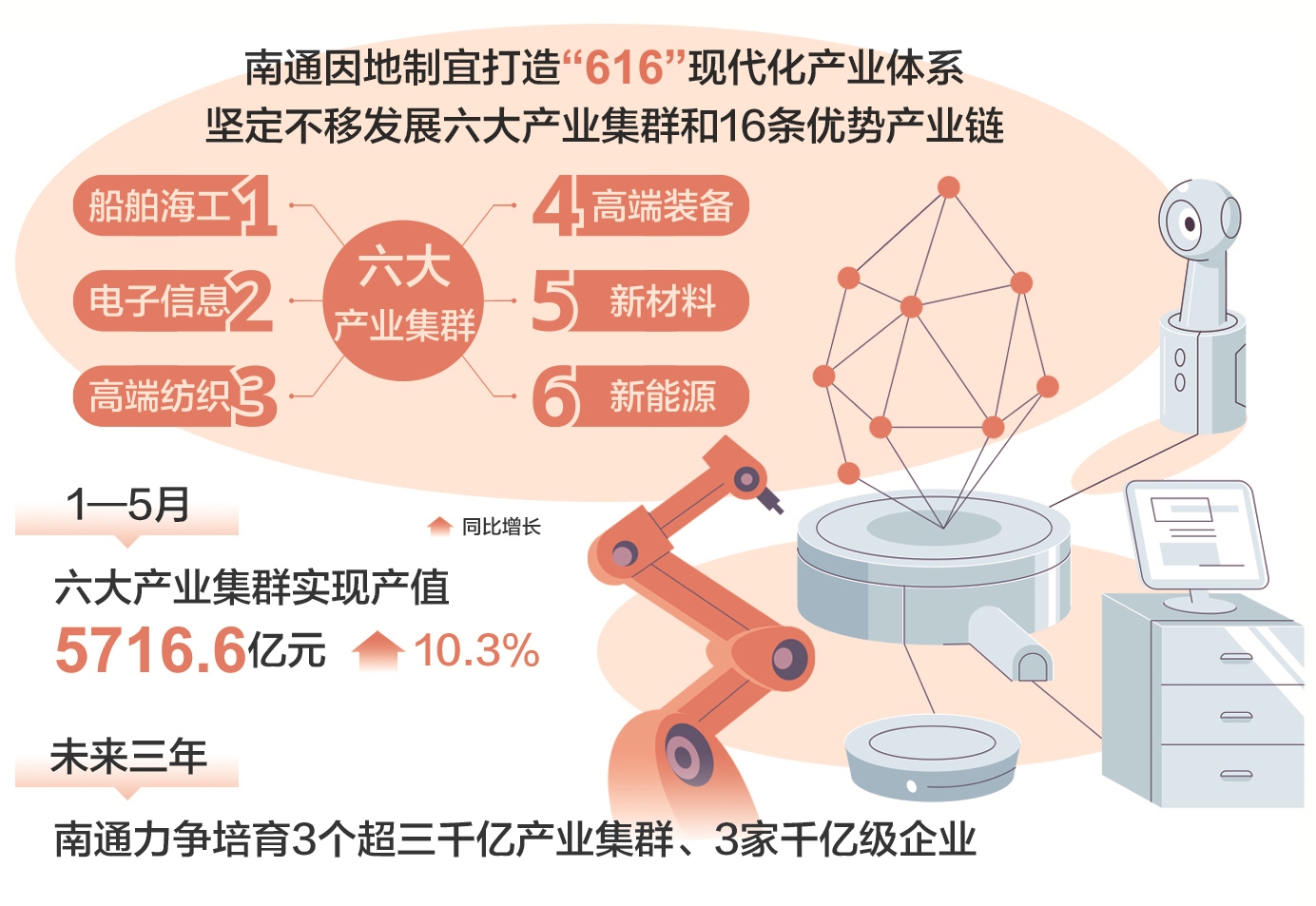 产业向新,聚链成势。一直以来,南通因地制宜打造“616”现代化产业体系,统筹传统产业改造升级、新兴产业发展壮大和未来产业前瞻布局等任务,坚定不移发展船舶海工、电子信息、高端纺织、高端装备、新材料、新能源六大产业集群和16条优势产业链,全力提高制造业发展能级。今年1—5月,六大产业集群实现产值5716.6亿元,同比增长10.3%,为南通迈向“下一个万亿”提供了强力支撑。