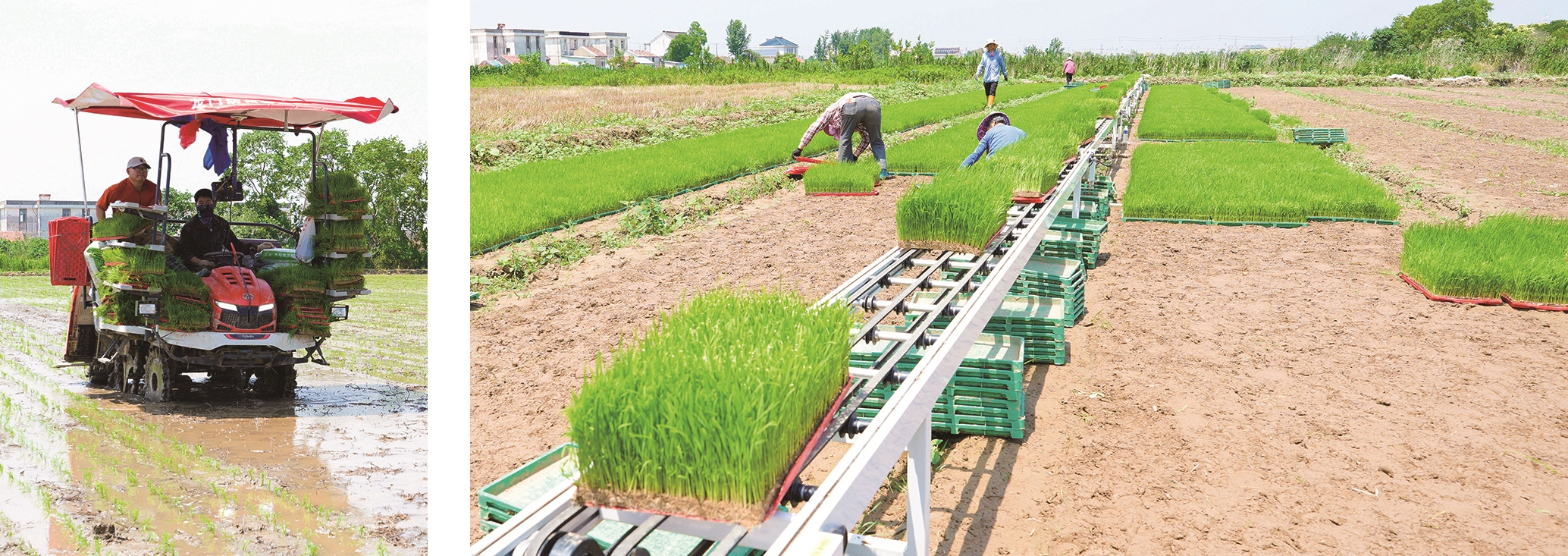 上午9点,如东和谐家庭农场育秧田里,一块块绿毯般的育秧盘陆续乘上“有轨电车”,在传送带的输送下,一一抵达插秧现场。随着两名机插手相互配合,一个摆放秧盘,一个驾驶机器,插秧机来回穿梭于水田间,所过之处,一株株嫩绿的秧苗整齐排列,转眼间便“织”出一片绿色网格。