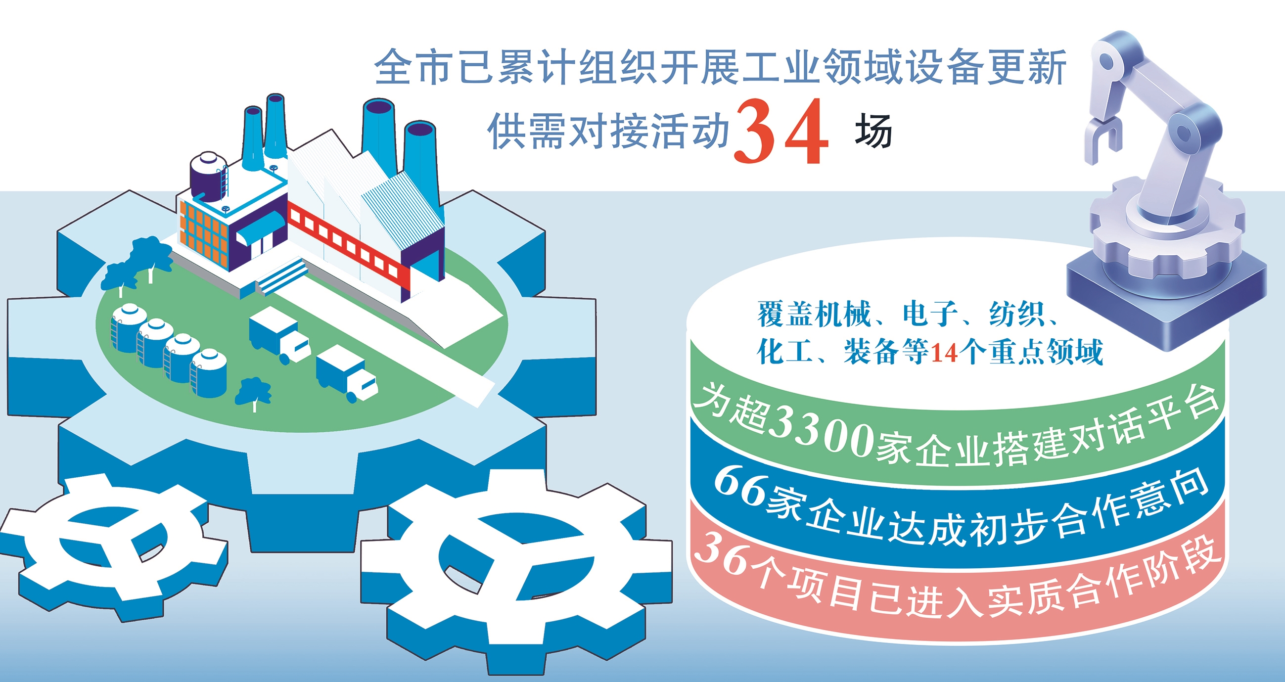 目前,全市已累计组织开展工业领域设备更新供需对接活动34场,覆盖机械、电子、纺织、化工、装备等14个重点领域,为超3300家企业搭建对话平台,66家企业达成初步合作意向,意向合作金额8645万元,36个项目已进入实质合作阶段,落地金额达2453万元,形成“供需精准匹配、产业协同升级”的良好态势,持续擦亮“好装备,南通造”品牌。