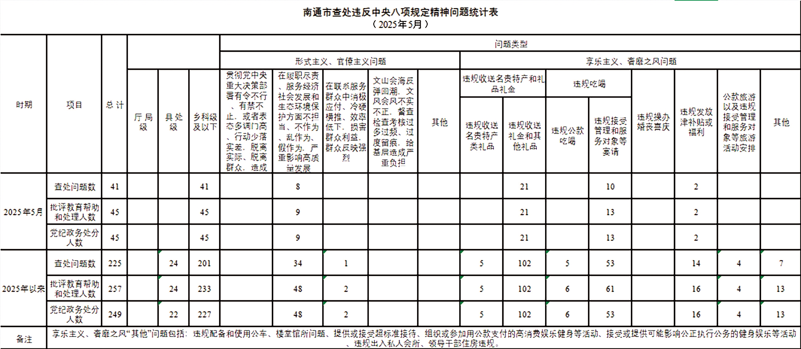 2025年5月,全市共查处违反中央八项规定精神问题41起,批评教育和处理45人,其中给予党纪政务处分45人。从问题类型看,查处形式主义、官僚主义问题8起、批评教育和处理9人,查处享乐主义和奢靡之风问题33起、批评教育和处理36人。从人员级别看,批评教育和处理乡科级及以下人员45人。