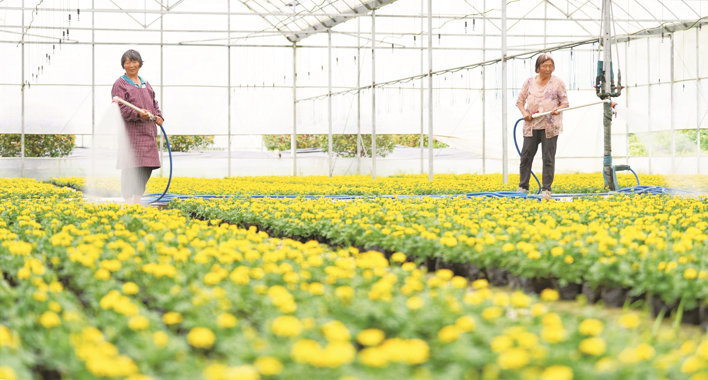 29日,村民在海安市胡集街道周吴村花卉种植大棚里管护盆栽花卉。近年来,当地积极调整农业产业结构,规模化、产业化发展花卉苗木等特色种植,促进农民增收、农业增效。 周强摄