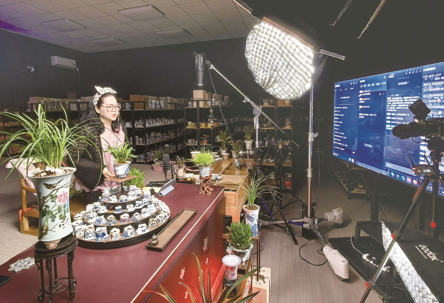 1日,如皋市城南街道夏庄社区电商共富中心直播基地内,主播正对着镜头展示小微盆景。作为国内首家盆景集散中心所在地,夏庄社区以电商直播为突破口,将小微盆景推向全国,销售额每月提升数十万元。 记者 尤炼摄