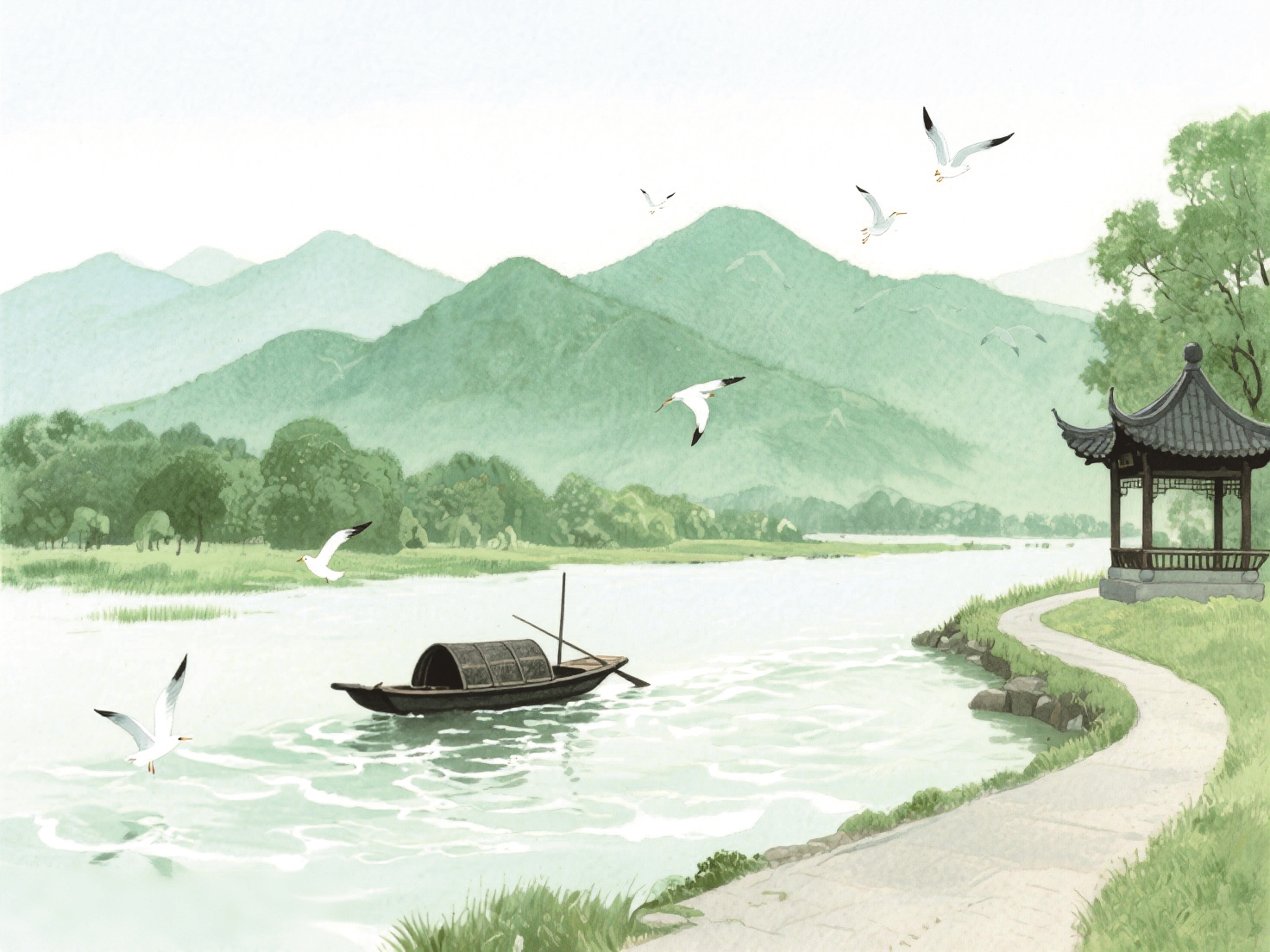 远处,绿意盎然的群山隐约可见