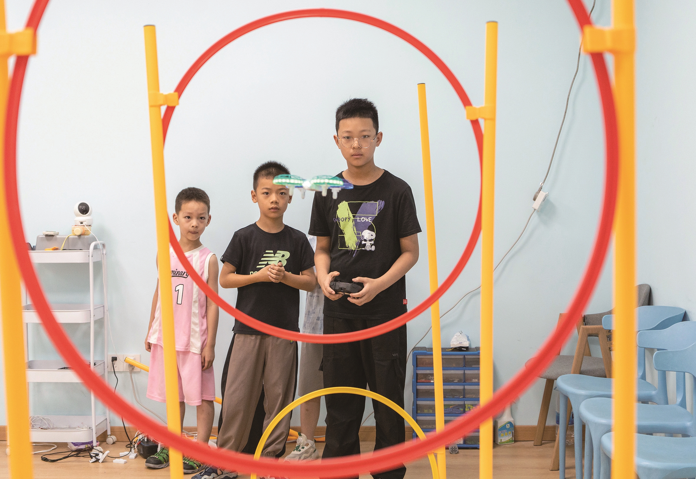 昨天,小朋友在通州区金新街道一家科技培训机构学习操控无人机。暑假期间,通州区不少孩子学习机器人编程、无人机操控、手工制作等科学课程,培养对科学技术的兴趣和爱好,体验科技带来的快乐。 CFP供图
