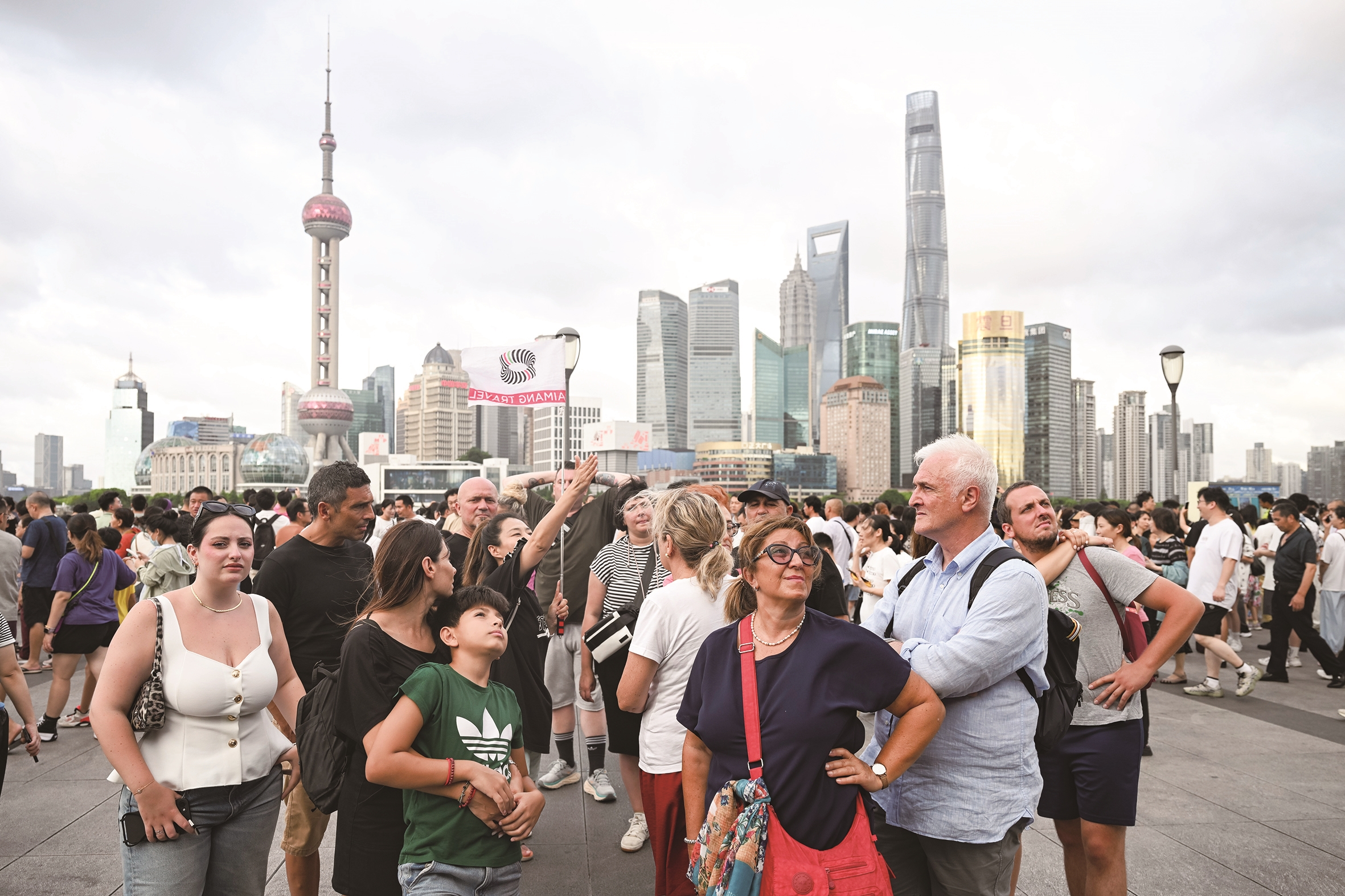 21日,意大利游客在上海外滩听导游介绍景点。中国实施的免签政策持续释放吸引力,我国入境旅游市场热度今夏继续攀升。作为入境游“第一站”的上海自7月1日起迎来暑期入境游热潮。7月1日至15日,上海边检机关在空港口岸累计查验入境外籍旅客18.7万人次,较去年同比增长35.5%。其中,已有9.2万人次外籍旅客利用免签政策和240小时过境免签政策从上海口岸入境,占入境外籍旅客总量近50%。 新华社照片