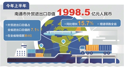 在国际经贸形势复杂多变的背景下,南通外贸逆势上扬,交出亮眼“成绩单”。据南通海关统计,今年上半年我市外贸进出口总值达1998.5亿元人民币,同比增长15.7%,增速领跑全省。外贸进出口总值占全省进出口总值的7.1%,在全省继续居第4位。