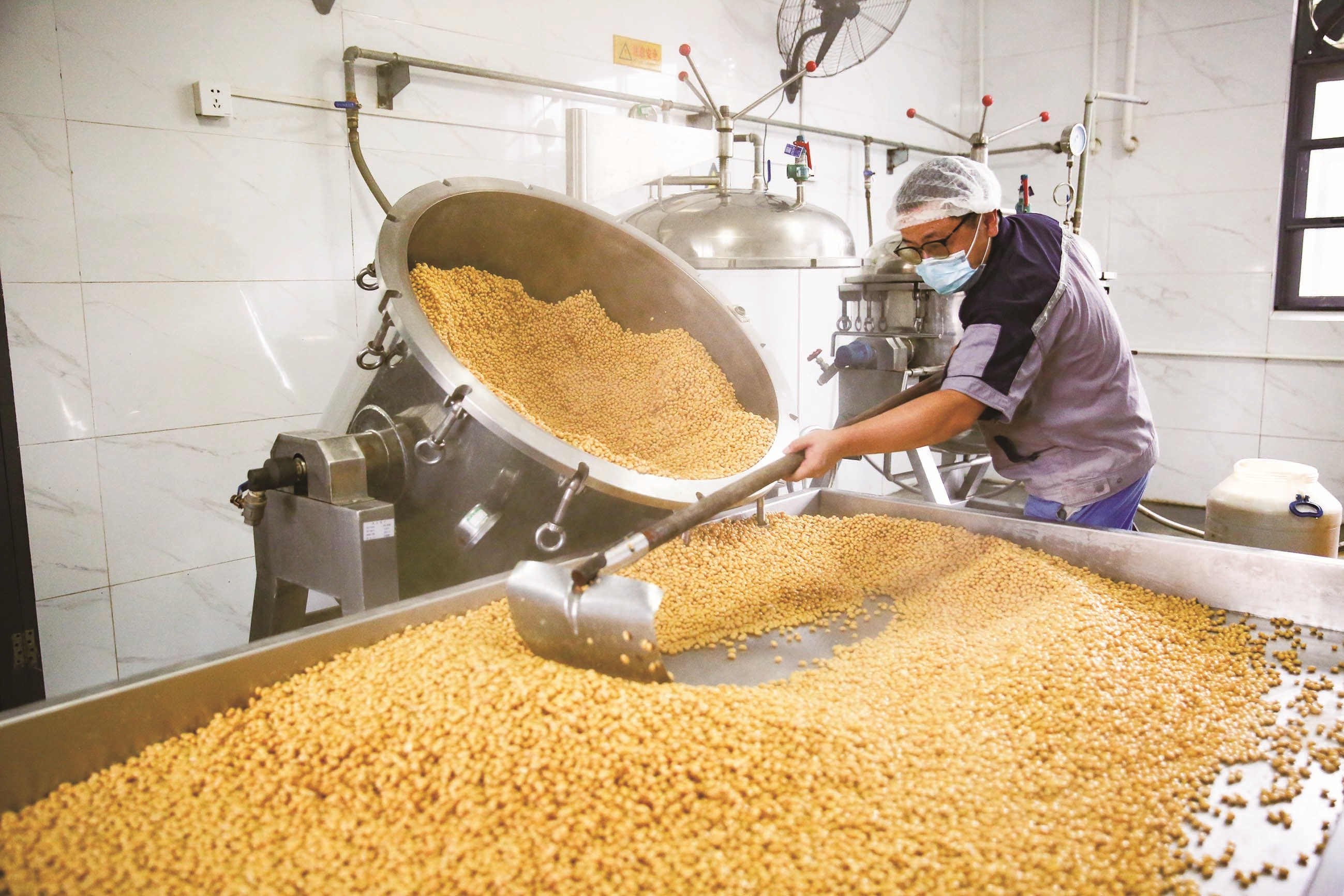 昨天,如皋市如城街道沿河村如皋老酱油生产基地,工人们正在按照选料蒸煮、接种装匾、制曲发酵等传统工序进行夏日古法酱油制作。眼下,如皋老酱油进入夏造酱油繁忙期。这种古法酿造技艺酿出来的酱油口感香味十足,在市场非常受欢迎。 CFP供图