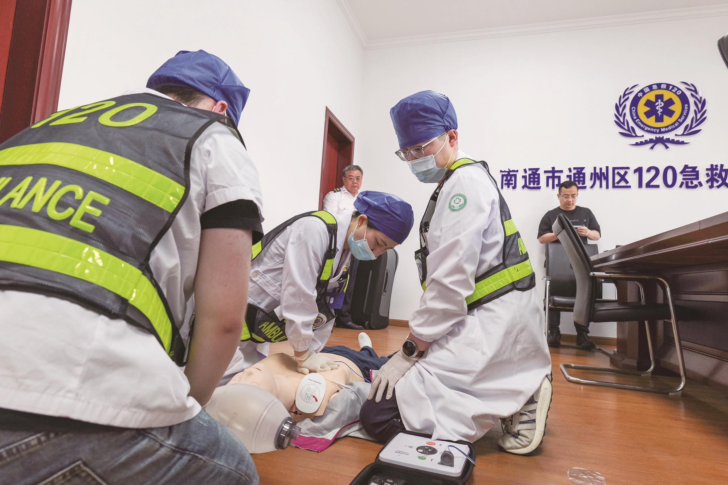 29日,通州区人民医院急救分站工作人员进行成人心肺复苏+除颤操作。当天,省院前急救质量控制中心专家组一行来到通州,开展2025年上半年度院前急救质量控制督查工作。 黄艳鸣文 葛卫明摄