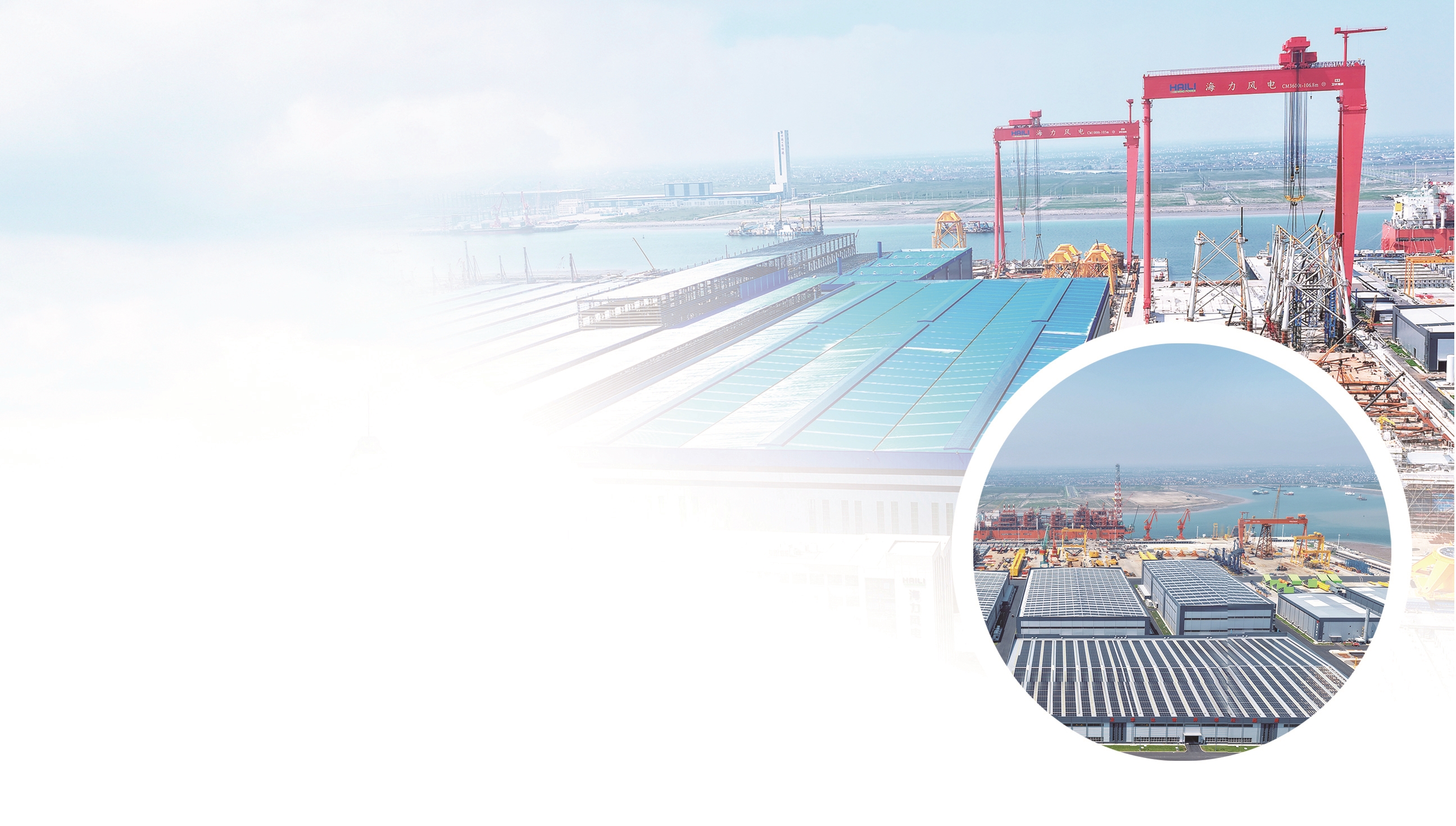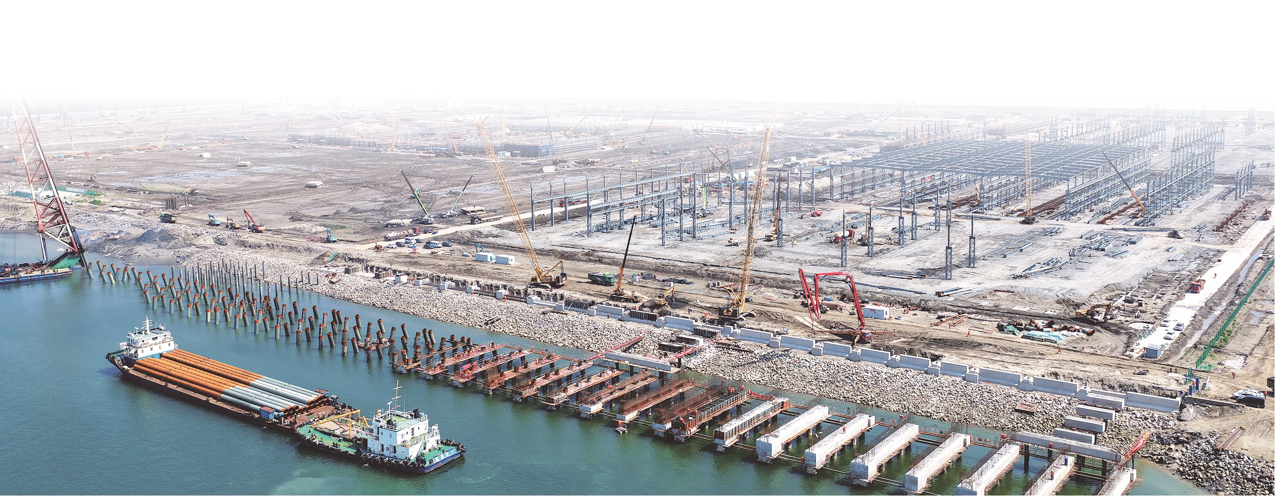 吕四港东港池,总投资90亿元的惠生海工装备制造基地,施工现场塔吊林立、机械轰鸣,目前厂房钢结构安装、码头桩基工程和超大船坞工程都在有序推进中。总投资3.5亿美元的省重大项目燕达(江苏)清洁能源装备制造项目也在加速建设。巨型钢结构骨架如钢铁森林般节节攀升,陆域工程已完成50%。工地上焊花飞溅、机器轰鸣,盛夏的热浪与建设的热情交织成奋进交响乐。