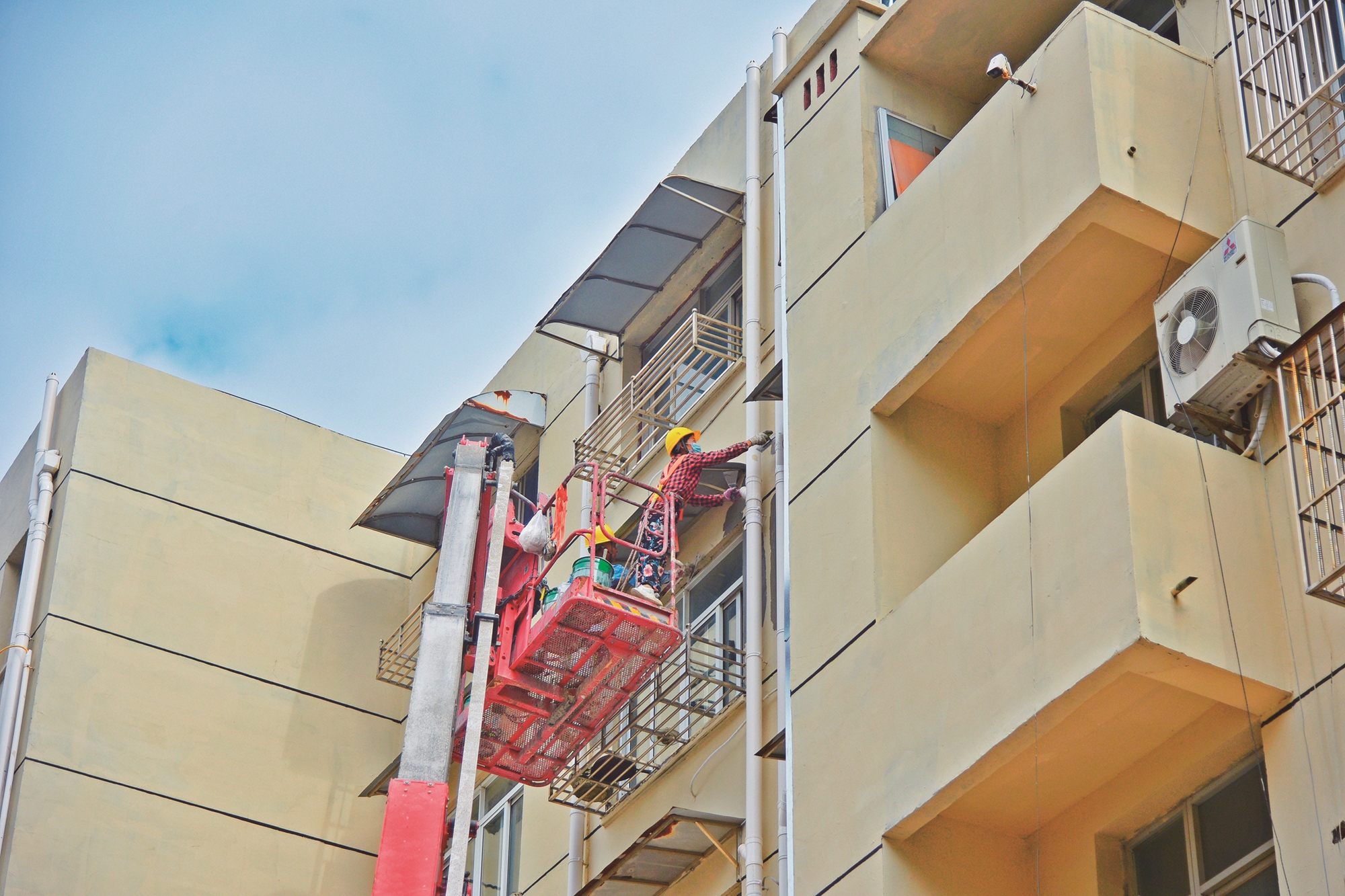 昨天,在如皋市如城街道城南社区,工人正在对一老旧小区居民楼立面墙进行施工作业。近年来,如皋市以城市更新行动为抓手,大力推进老旧小区改造提升项目,不断优化人居环境,城市旧貌换新颜。今年,该市计划改造提升4个老旧小区,改造居民住宅楼41幢,涉及居民1540户,改造总面积达15.7万平方米。 吴树建摄