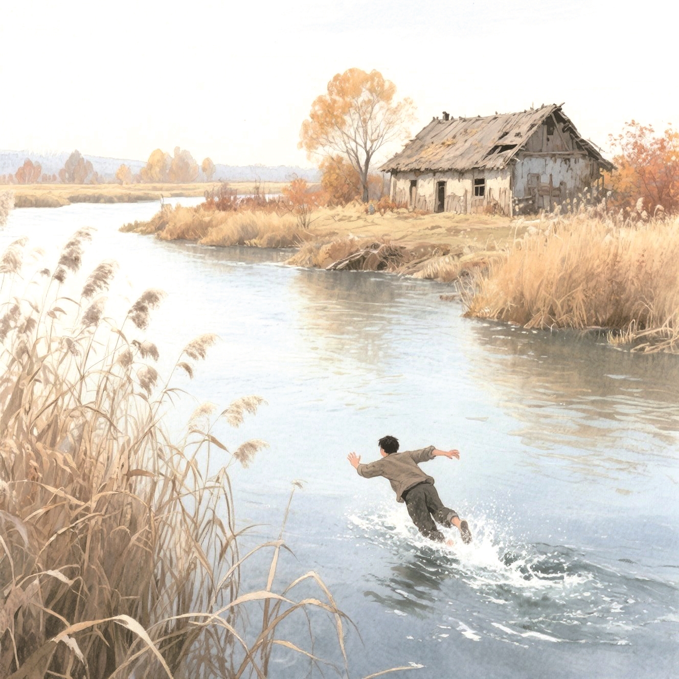 1942年深秋,芦福生执行送情报任务途中突遇日军。他迅速隐蔽,观察敌情时不幸暴露。鬼子端着明晃晃的刺刀,向他包抄过来,意图生擒。生死关头,为保护情报,芦福生爆发出全身力气,几个箭步冲进路旁的芦苇荡。敌人紧追不舍,他奋力穿出芦苇丛,眼前一条大河横亘。他纵身跃入冰冷的河水中,奋力向对岸游去。上岸后,疾奔向远处一幢破旧茅屋。追兵赶到河边,见人去已远,气急败坏地向河对岸疯狂射击。