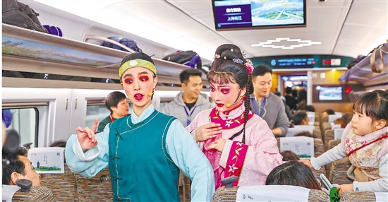 12月26日,演员在沪苏湖高铁首发列车G9508次上表演。 拍友 何伟卫 摄