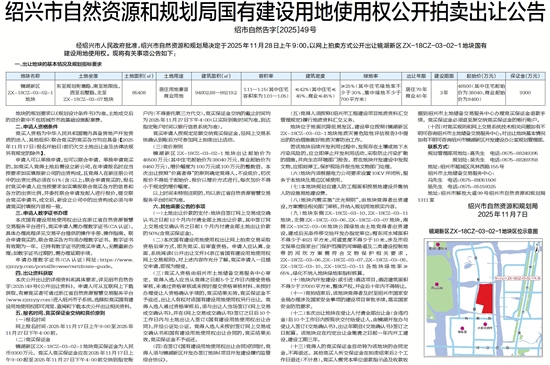 经绍兴市人民政府批准,绍兴市自然资源和规划局决定于2025年11月28日上午9∶00,以网上拍卖方式公开出让镜湖新区ZX-18CZ-03-02-1地块国有建设用地使用权。现将有关事项公告如下: