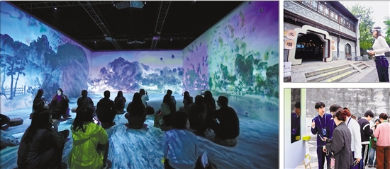 左图:《光影丹青》沉浸式画境空间现场。右上图:游客在“文澜重光·数韵流芳”活动中体验穿越时空。右下图:游客在闲鱼工作人员指引下,体验AI卖闲置物品。 均由受访者供图