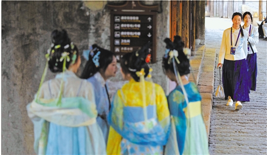 身着汉服的游客和“小梧桐”志愿者擦肩而过。