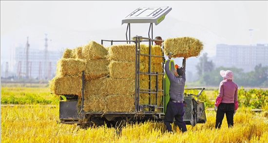 日前,在乐清市蒲岐镇娄岙村,农民驾驶农机,回收秸秆。近年来,乐清市依托秸秆收储运体系,提高秸秆肥料化、饲料化、基料化等综合利用率,让秸秆变废为宝。