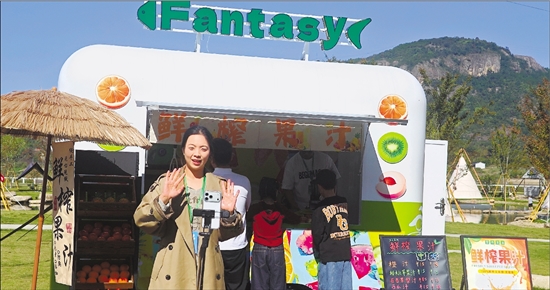 邵安琦在高浦渔村为摊主做直播。 本报记者 谢甜泉 摄