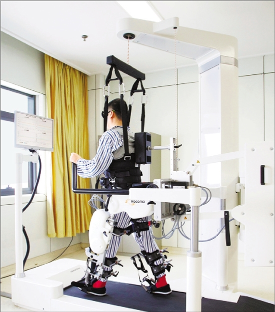 患者利用下肢外骨骼机器人进行步行能力重建训练。 受访者供图