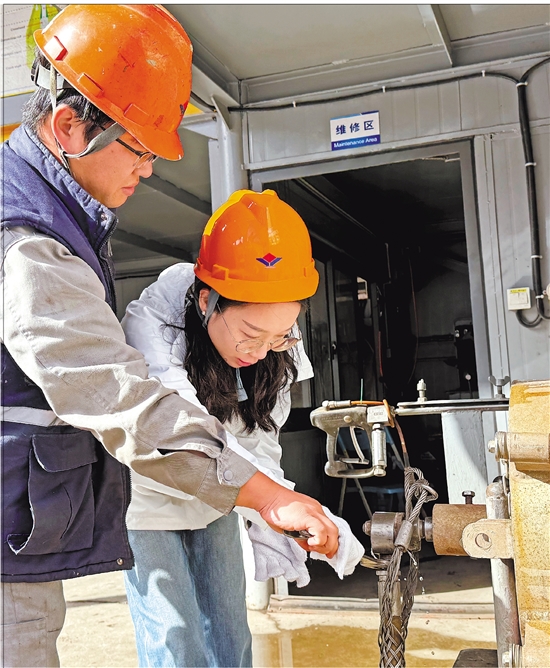 记者(右)与工作人员用扳手将机器人接口拧紧。 见习记者 郑宇 摄