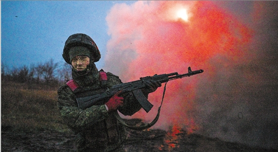 当地时间12月2日,顿涅茨克地区,俄罗斯“中部”军队集群的军人向乌克兰阵地发射BM-21“冰雹”多管火箭炮。 CFP供图