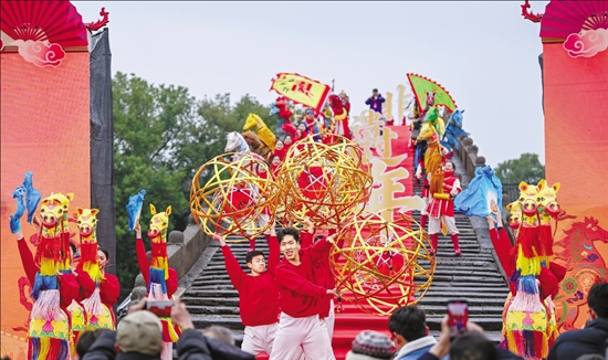 1月31日,杭州临平区“非遗过大年”系列活动在塘栖古镇启动。广济桥头化身天然实景舞台,高头竹马、临平滚灯等传统非遗项目陆续上演。 本报记者 董旭明 摄