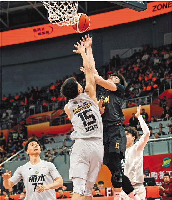 杭州队(黑衣)与丽水队交锋现场。 本报记者 姚颖康 摄