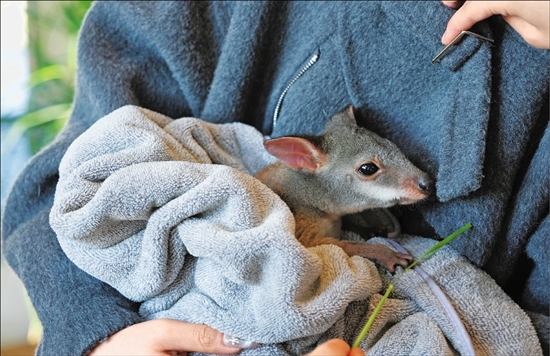 游客在跟袋鼠互动。 本报记者 郁馨怡 摄