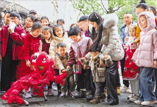 2月17日,以“国潮嬉游 马上有戏”为主题的开年大秀在杭州清河坊历史街区火热上演,传统舞狮与现代机器狗同场竞技,为游客献上一场传统与科技碰撞的新春大餐。 本报记者 栾兰 摄