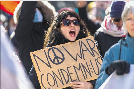 3月21日,在加拿大魁北克省蒙特利尔,一名女子手举标语参加抗议美国和以色列军事打击伊朗的集会。 新华社/法新