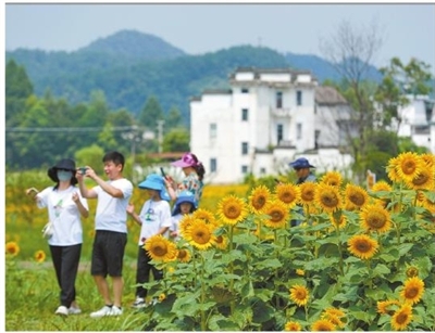 8月9日,游客在安徽省黄山市屯溪区屯光镇汉沙村欣赏向日葵花海。 暑期,人们来到户外亲近自然,放松身心,乐享假期。 ■新华社发