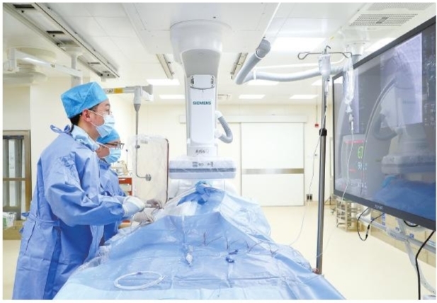 8月10日,慈溪市第三人民医院医疗健康集团心内科医生在为患者进行DSA(数字减影血管造影)介入诊疗。DSA介入诊疗平台,能清晰地观察到人体内微细血管的变化,提高医疗确诊率,为手术和介入治疗提供更方便、更准确的数据,为救治急危重症病人赢得生命和时间。 ■摄影 全媒体记者 王烨江 通讯员 高方