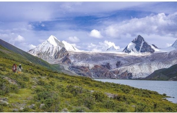 游人在萨普雪山下的湖边徒步(8月16日摄)。 萨普雪山位于西藏那曲市比如县境内,这里分布着冰川、湖泊和草场,美景如画。近年来,随着交通条件的改善,越来越多的游客来到萨普雪山领略壮美风光。 ■新华社发