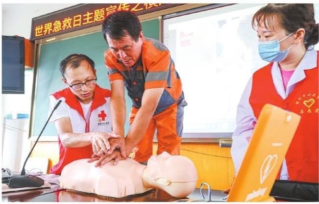近日,横河镇红十字会、镇环卫站、市人民医院医疗健康集团横河分院联合在镇成校开展应急救护知识讲座,红十字讲师楼程勤医生为环卫工人讲解了心肺复苏和除颤仪使用知识,并现场指导操作,提高他们的急救能力。 ■摄影 全媒体记者 蒋亚军 通讯员 张朝峰 黄柏明