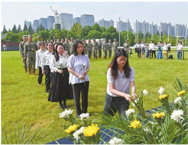9月3日,各界代表在侵华日军南京大屠杀遇难同胞纪念馆的中国人民抗日战争暨世界反法西斯战争胜利78周年纪念活动中敬献鲜花。当日,侵华日军南京大屠杀遇难同胞纪念馆举行中国人民抗日战争暨世界反法西斯战争胜利78周年纪念活动。南京大屠杀幸存者后代代表、中国人民解放军官兵代表、青少年代表、紫金草志愿者代表和纪念馆馆员代表等通过敬献鲜花、诗歌朗诵、合唱等形式,铭记历史,缅怀先烈。■新华社发