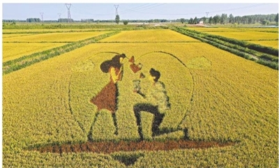 这是9月6日拍摄的台安县辽河文化旅游景区里的稻田画(无人机照片)。初秋时节,辽宁省鞍山市台安县辽河文化旅游景区的稻田画吸引不少游客前来参观游览。由多种颜色组成的巨型稻田画勾勒出丰收壮美景象。■新华社发