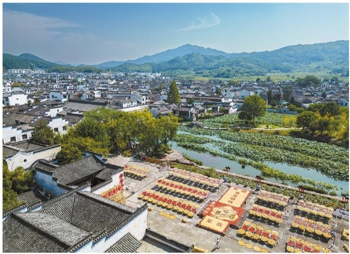 这是呈坎古村内的晒场(9月11日摄,无人机照片)。 地处皖南山区的安徽省黄山市徽州区呈坎古村自古都有晒秋习俗。近年来,晒秋时节,该村村民会将农作物在村中广场集中晾晒,构成一幅五谷丰登的秋收画卷,吸引不少游客前往观赏,成为当地秋日里的旅游特色。 ■新华社发