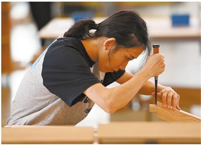 9月17日,参赛选手在参加木工项目比赛。当日,在国家会展中心(天津)举办的中华人民共和国第二届职业技能大赛进入第二天,来自全国36个代表团的4000多名能工巧匠在109个赛项中同台竞技,切磋技艺。 ■新华社发