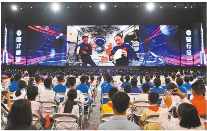 9月21日,在北京航空航天大学,学生收看“天宫课堂”第四课。“天宫课堂”第四课在中国空间站正式开讲,神舟十六号航天员景海鹏、朱杨柱、桂海潮进行授课。本次太空授课活动继续采取天地互动方式进行,共设立北京航空航天大学等5个地面课堂。3名航天员将在轨展示介绍中国空间站梦天实验舱工作生活场景,演示球形火焰实验、奇妙“乒乓球”实验、动量守恒实验以及又见陀螺实验,并与地面课堂进行互动交流。