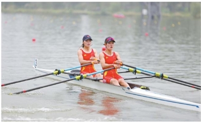 9月24日,邹佳琪(左)/邱秀萍在决赛中。 当日,在杭州亚运会赛艇女子轻量级双人双桨决赛中,中国组合邹佳琪/邱秀萍夺得冠军,斩获本届亚运会首金。 ■新华社发