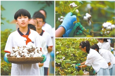 近日,宗汉街道新世纪小学学生在校园内的“尚耕园”进行棉花采摘活动,孩子们在劳动中享受丰收的喜悦。
