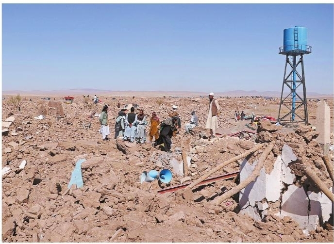10月9日,在阿富汗赫拉特,人们在清理废墟。 截至10月8日晚,阿富汗西北部7日发生的地震已导致2445人死亡,预计地震造成的伤亡人数将进一步上升。