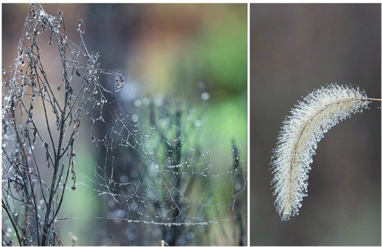 初秋时节,清晨,森林公园里的草丛、蛛网都挂上了晶莹的露珠,如同一粒粒珍珠,显得格外耀眼。