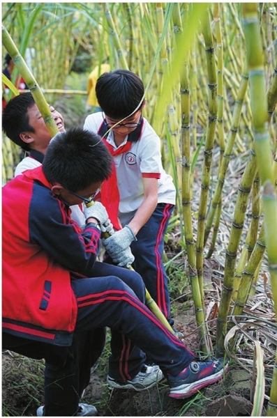 近日,城区中心小学西部校区莫言中队开展“寻秋 探秋 赏秋”社会实践活动。图为学生们正在收获甘蔗。 ■摄影 全媒体记者 冯梦苓 通讯员 高娇娇