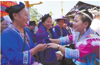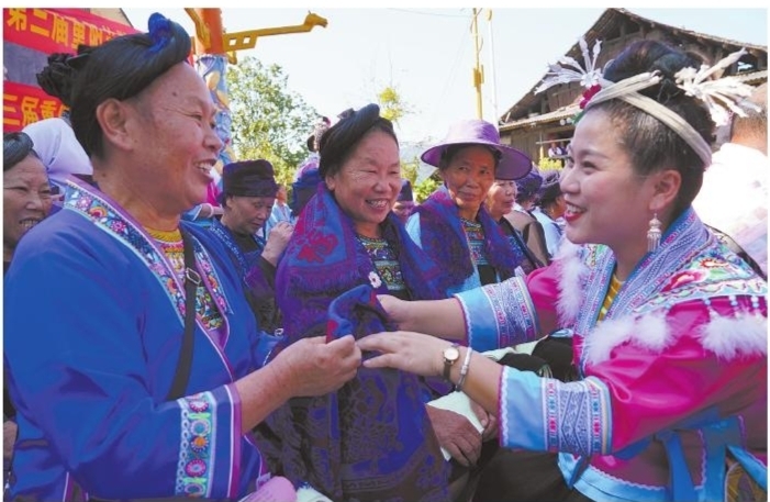 10月21日,在广西融水苗族自治县白云乡龙岑苗寨,外嫁女给老人赠送过节物品。 重阳节来临之际,各地举行丰富多彩的活动,与老人们一起喜迎传统佳节。 ■新华社发