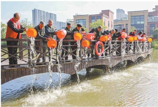 日前,宗汉街道治水办携手漾山村退役军人服务站,在漾山路江畔的五水共治公园开展增殖放流活动。 ■摄影 全媒体记者 蒋亚军 通讯员 潘美琴